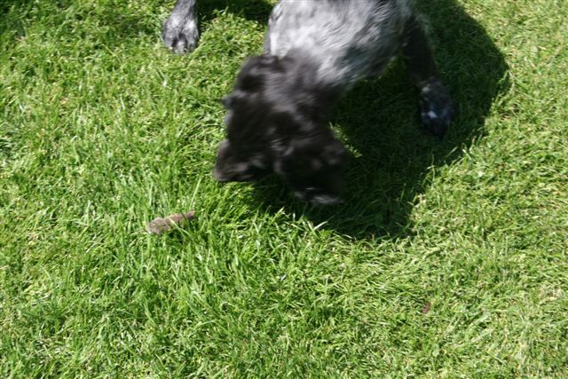 Freya blaft als een dolle tegen de muis en probeert haar te imponeren....